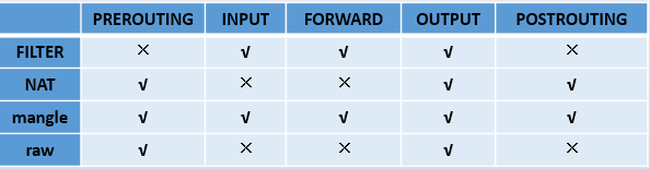 TABLE当然是指filter、raw、mangle、NAT四种表了,如上面的解释,一个表中,所拥有的链是特定的,常规的防火墙设定都是针对filter表