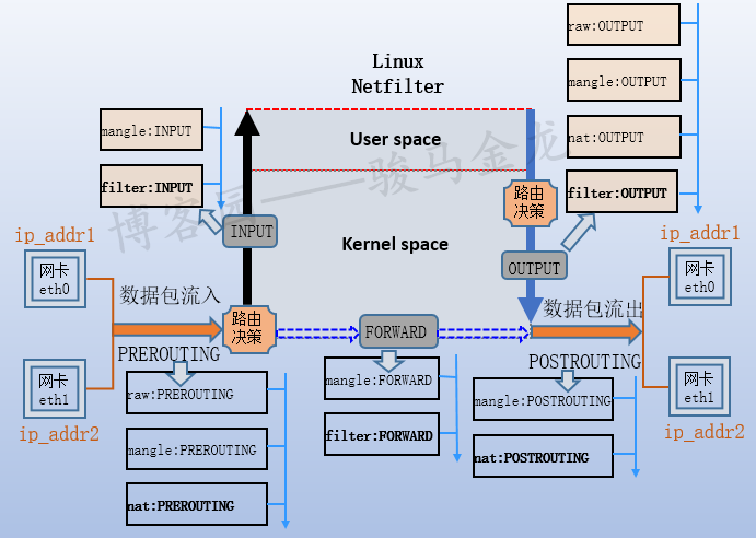 再例如ping本机地址(如127.0.0.1)的时候,ping请求从用户空间发送后,数据包从用户空间流出,于是经过路由决策发现是某网卡的地址,然后流经到OUTPUT,并从此网卡流出。但是由于ping的目标为本机地址,所以数据包仍从流出的网卡流入,并被INPUT链检查,最后返回ping的结果信息。