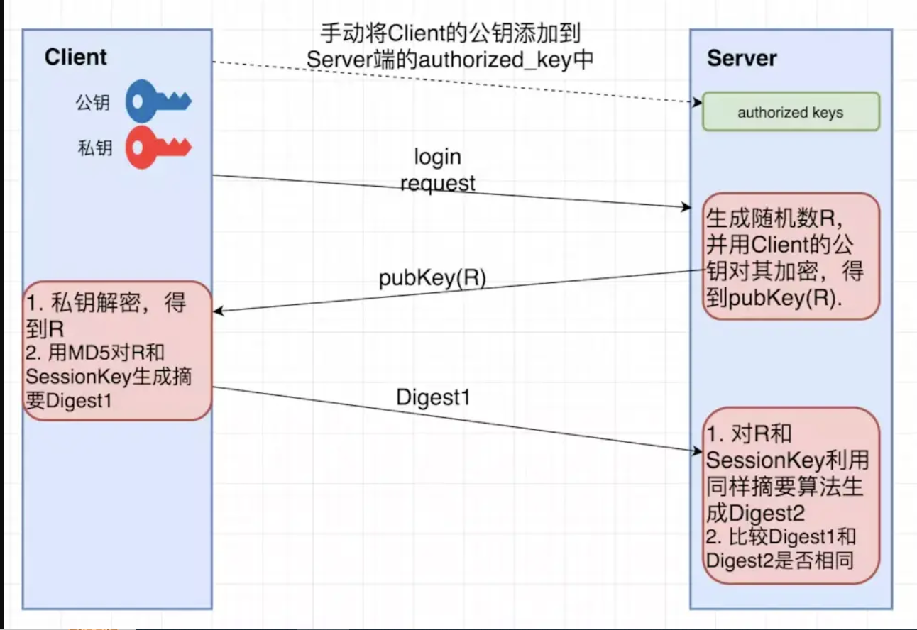 所谓"公钥登录",原理很简单,就是用户将自己的公钥储存在远程主机上。登录的时候,远程主机会向用户发送一段随机字符串,用户用自己的私钥加密后,再发回来。远程主机用事先储存的公钥进行解密,如果成功,就证明用户是可信的,直接允许登录shell,不再要求密码。